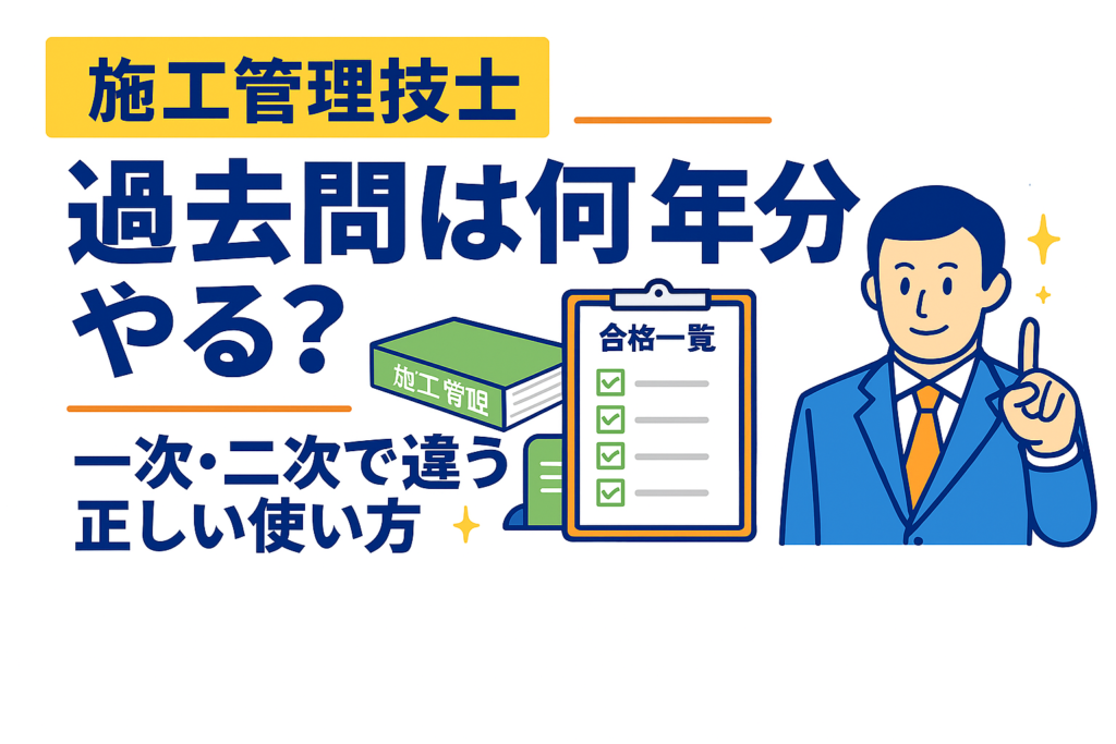 施工管理技士試験の合否は、「過去問を何年分持っているか」ではなく、「どう使ったか」で決まります。 何年分やれば足りるのか分からない 一次と二次で同じ勉強法をしていいのか不安 過去問をダウンロードしただけで止まっている そんな状態の方は、まず... -